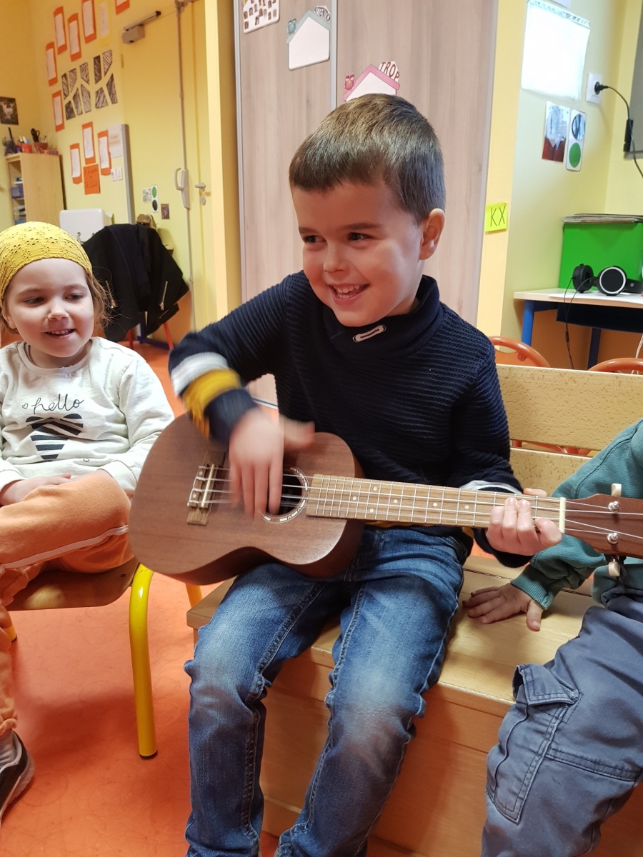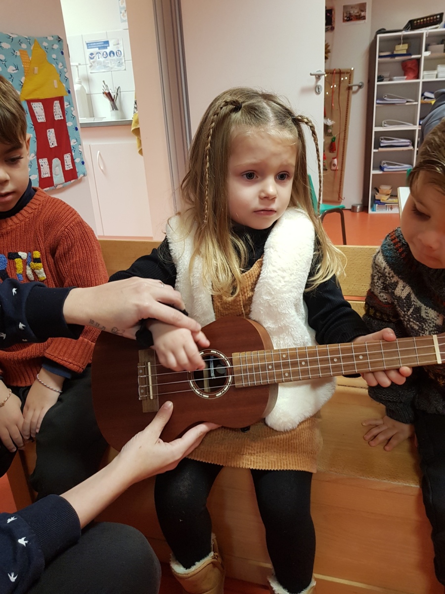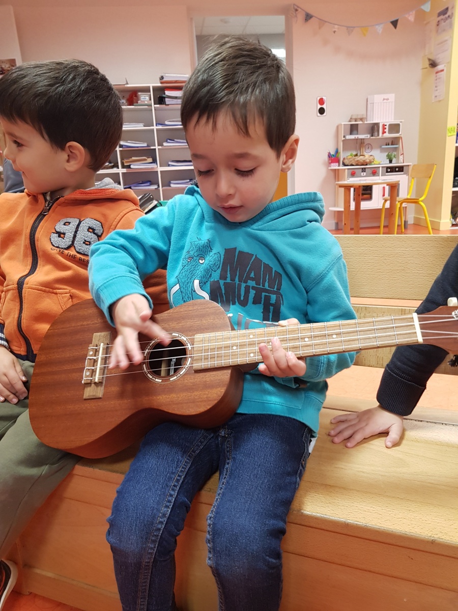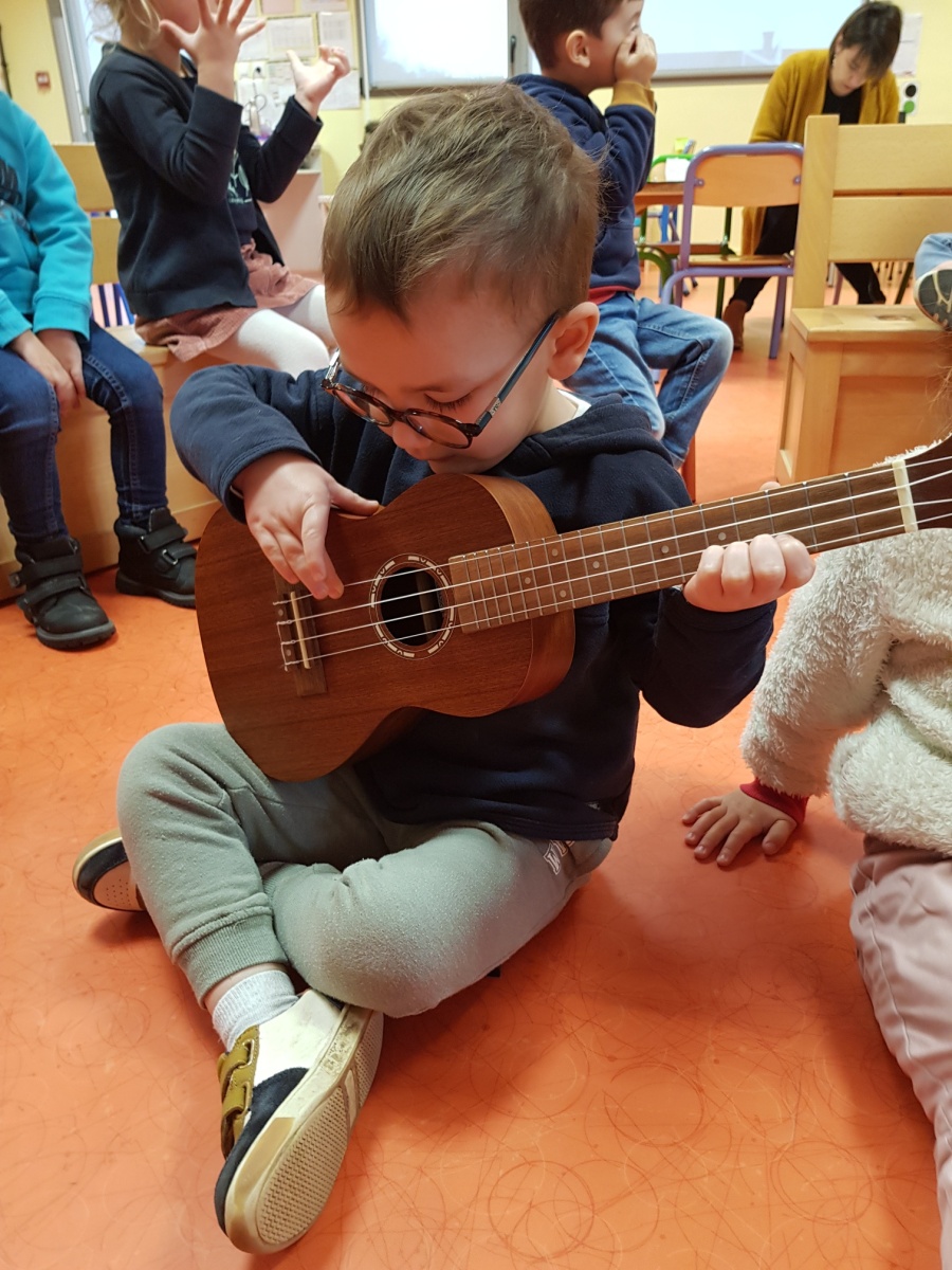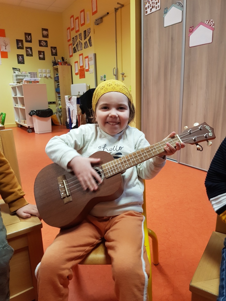 Cette semaine, les élèves de la classe de Julie ont gratté les cordes du “Ukulélé” de Camille.